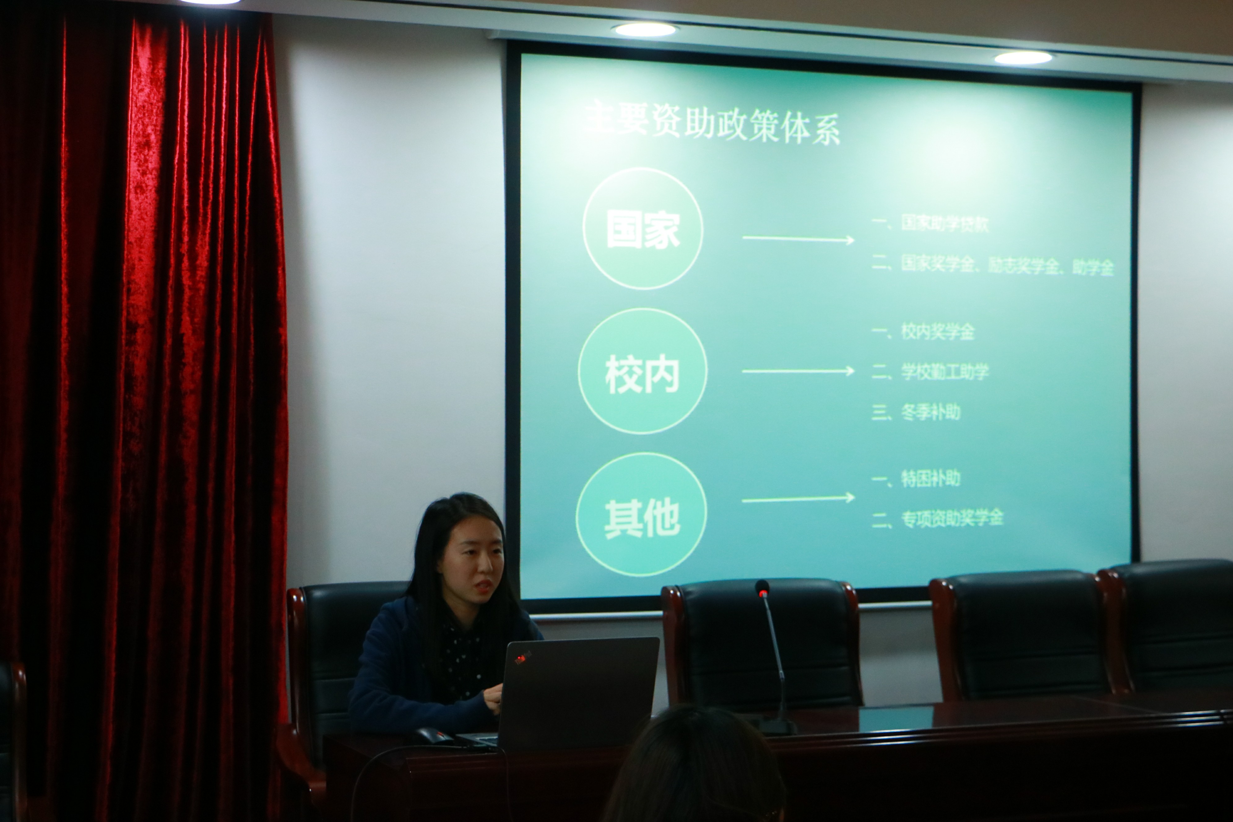 会上,杨惠茹从资助范围、资助标准、申请条件、申请时间、发放时间依次进行详细讲解,为同学们介绍了我校包括“奖、助、贷、勤、补、免、保”在内的多元化资助政策体系,并向同学们提出“使资助政策的效用最大化”的相关建议。