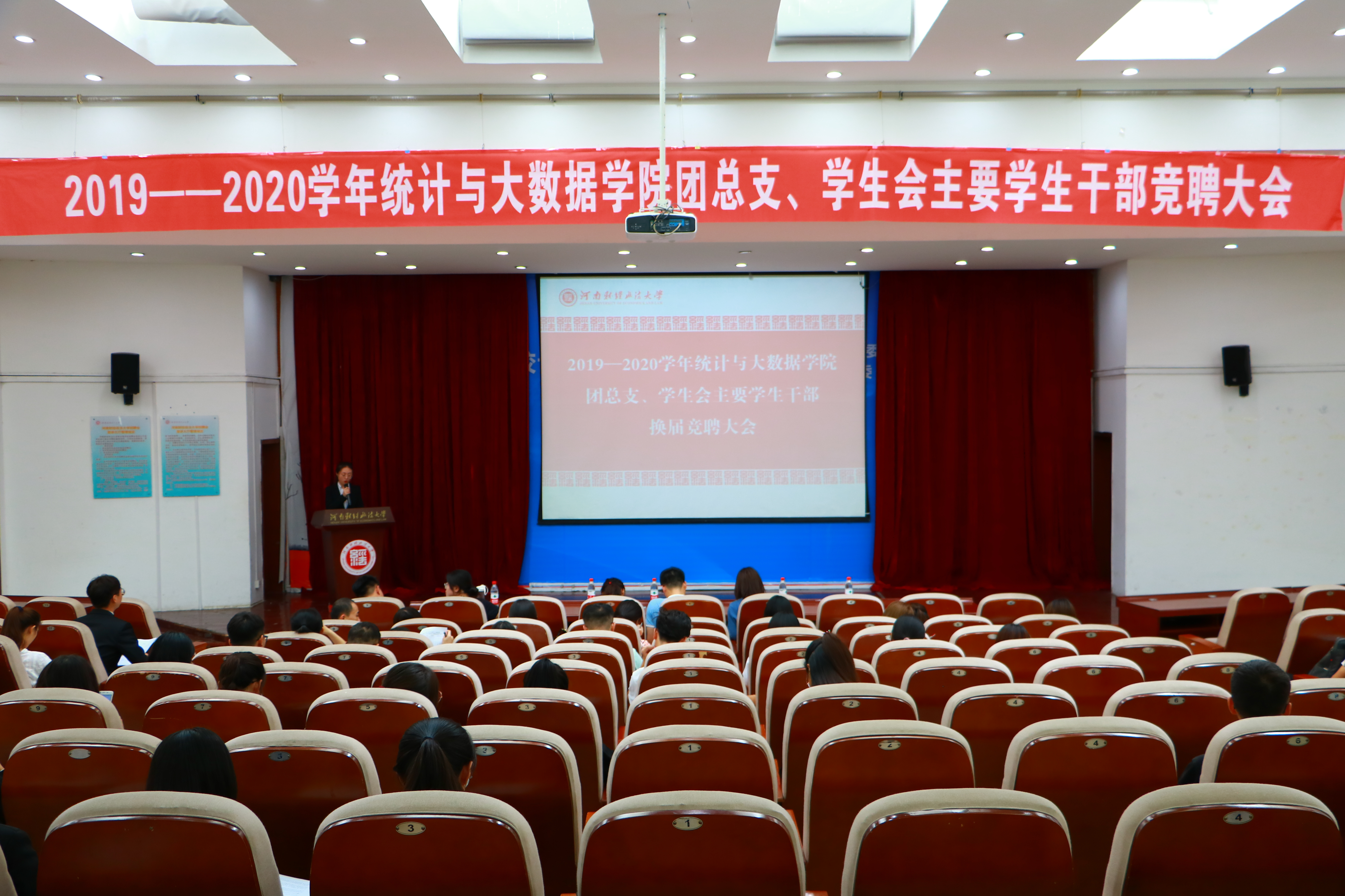 6月17日中午,威尼斯官网于第一教学楼220室召开2019-2020学年团总支、学生会主要学生干部换届选举大会,院团委书记张淼、团委副书记郭粹、辅导员王昕出席本次大会,40位主要学生干部竞聘者逐一登台发表演讲。