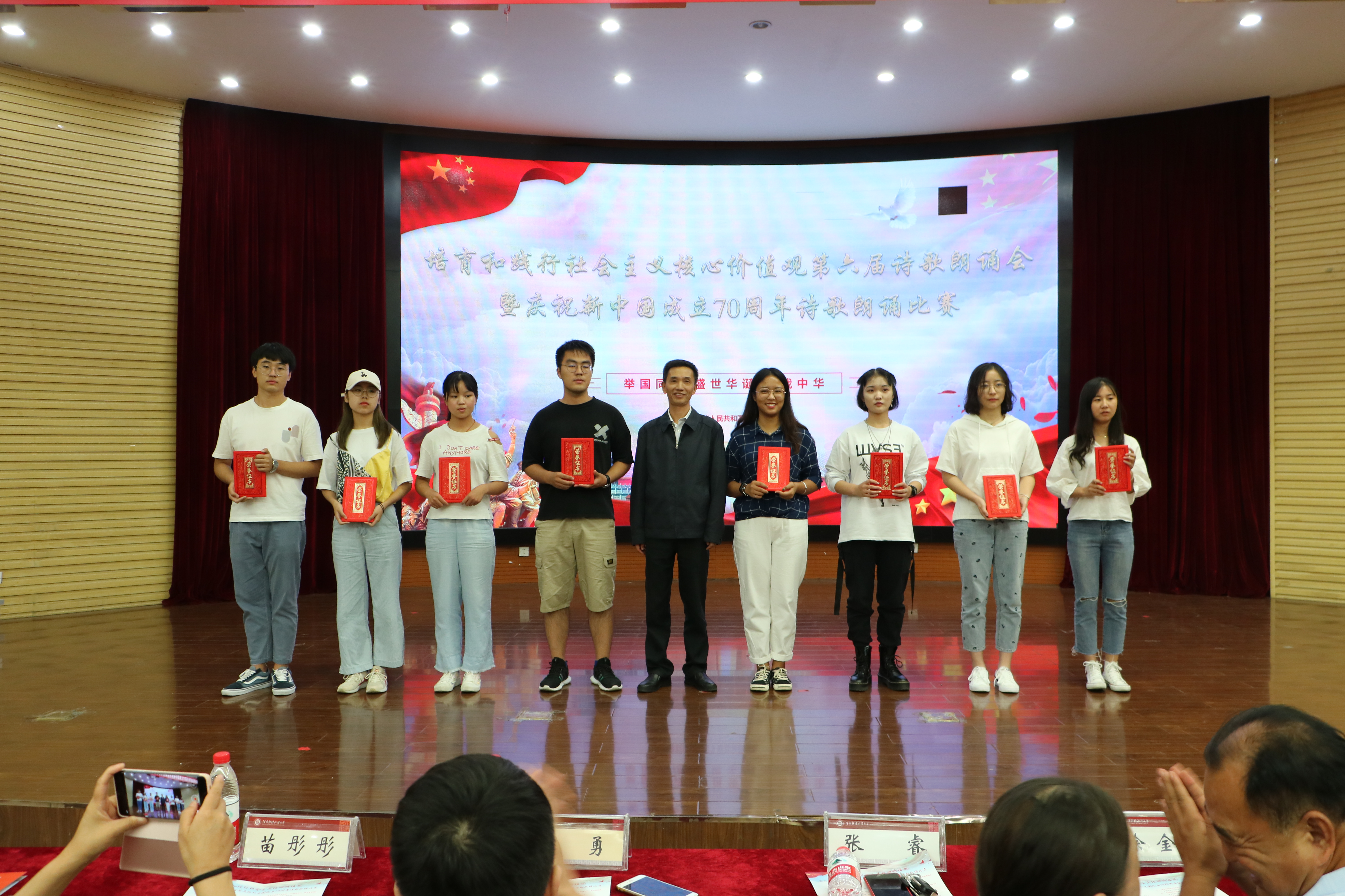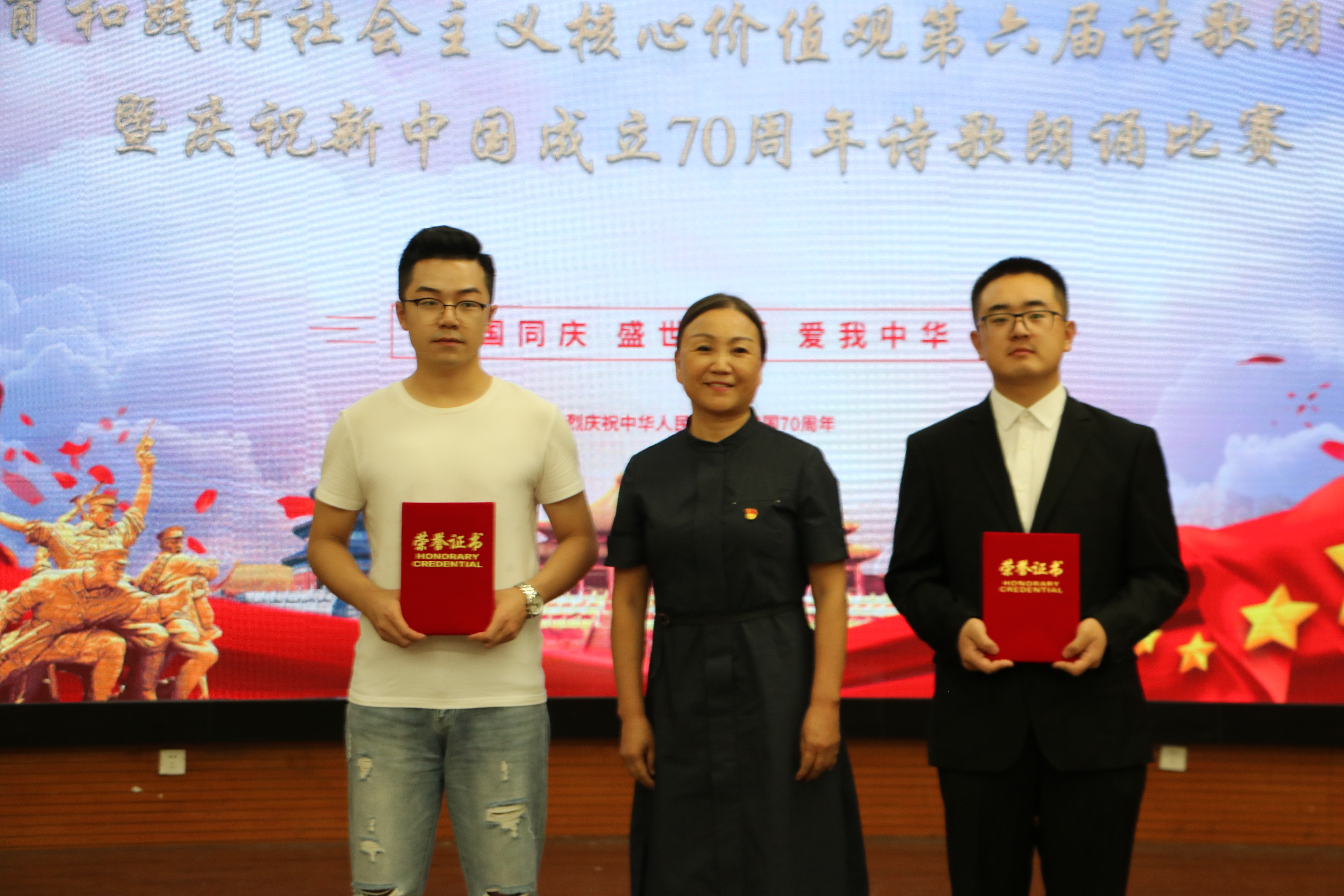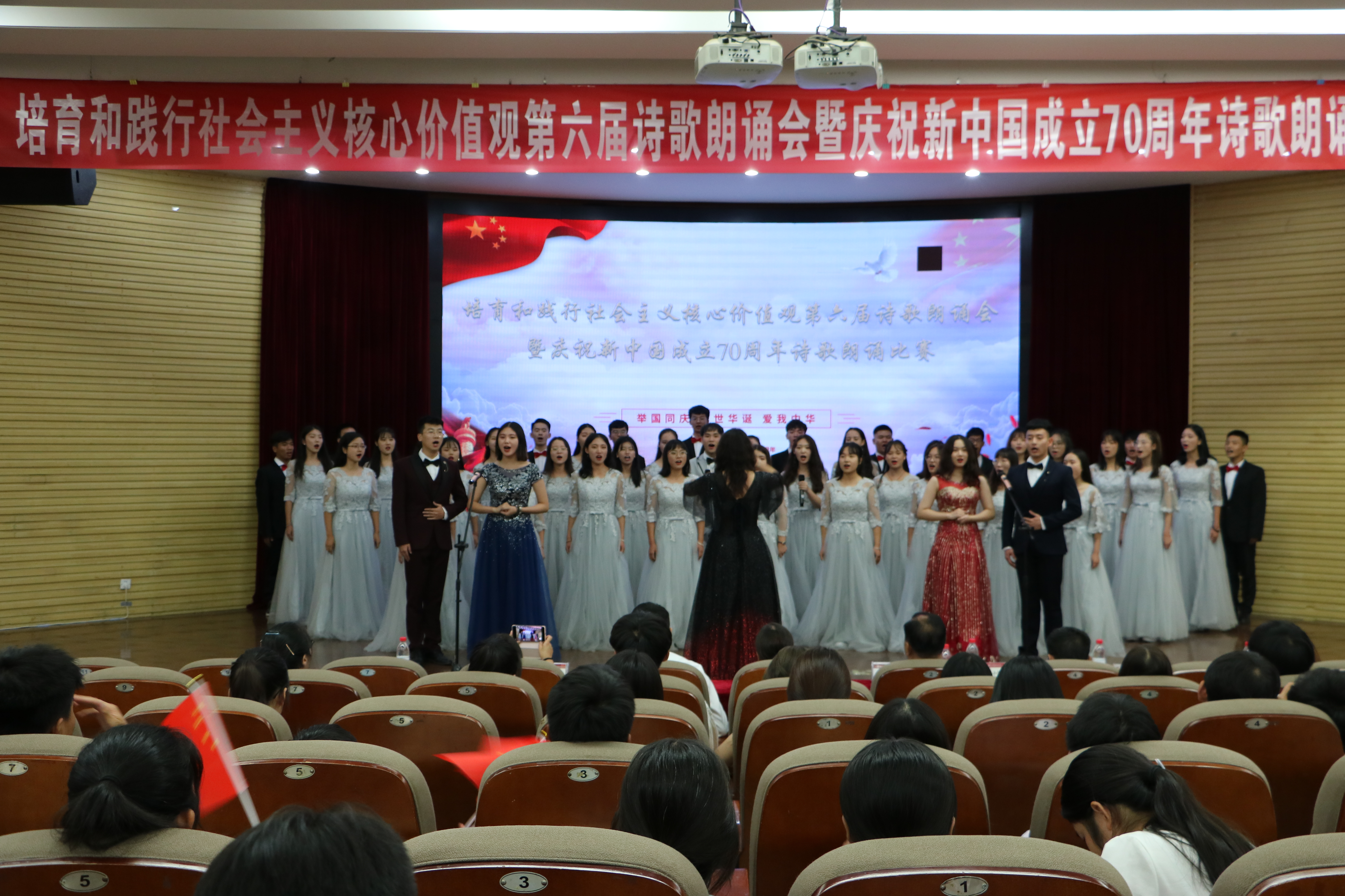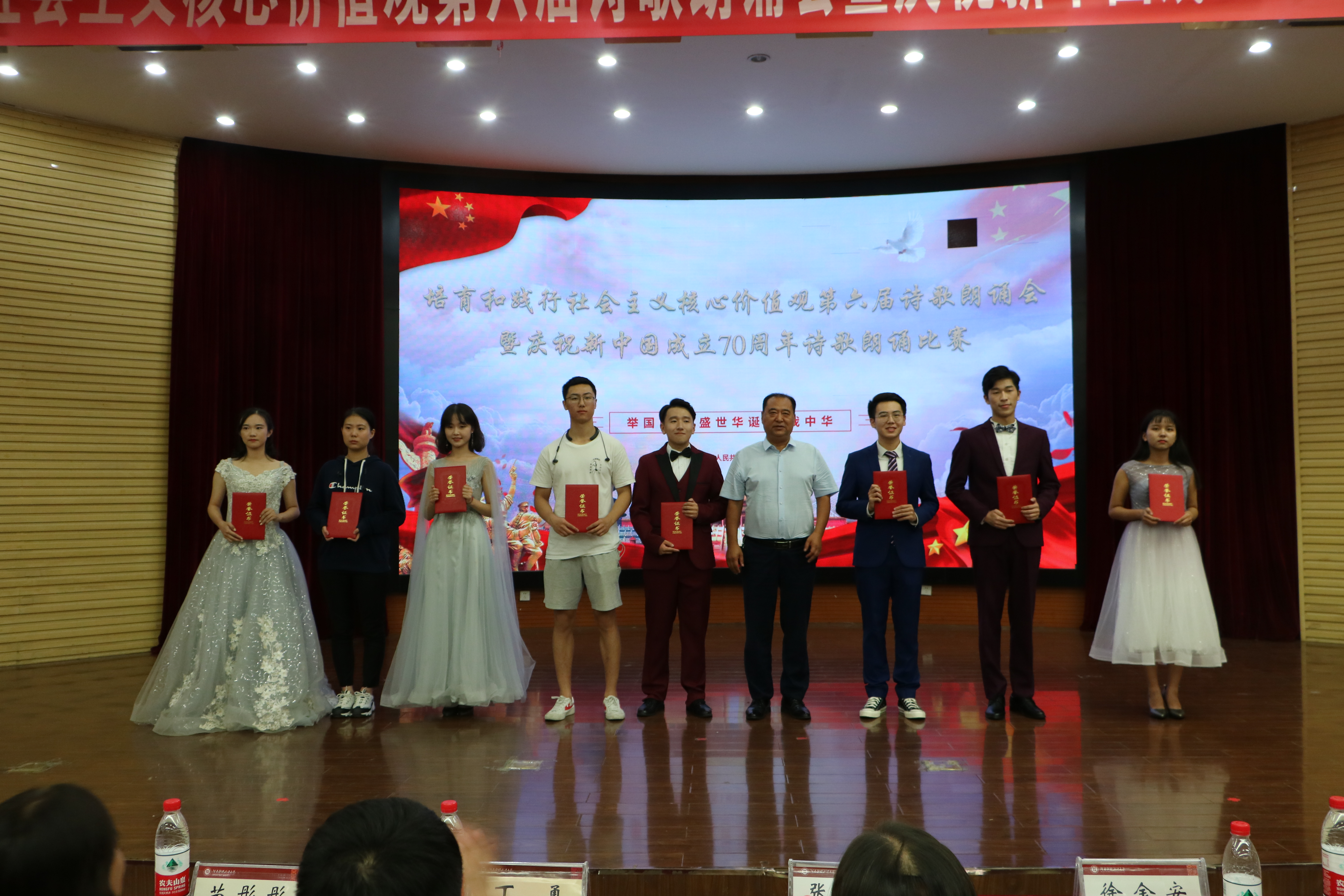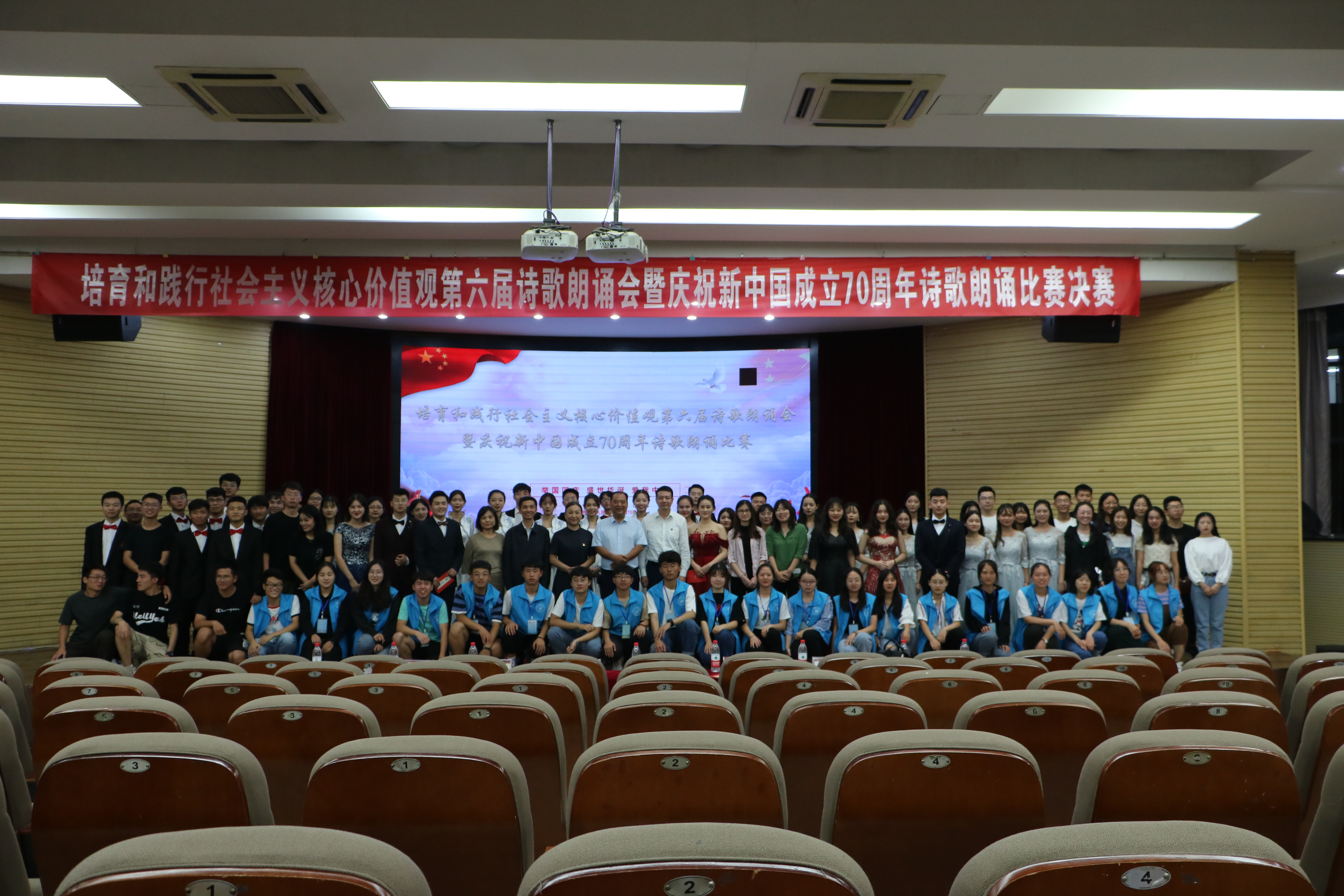 9月24日,由校党委宣传部主办、威尼斯432888cam承办的培育和践行社会主义核心价值观第六届诗歌朗诵会暨庆祝新中国成立70周年诗歌朗诵比赛决赛在第一教学楼219报告厅举行。校党委宣传部部长张睿、副部长丁勇,校团委副书记李曼,威尼斯432888cam党委书记徐金安、院长刘定平、党委副书记苗彤彤等领导老师与400余名学生共同观看了比赛。